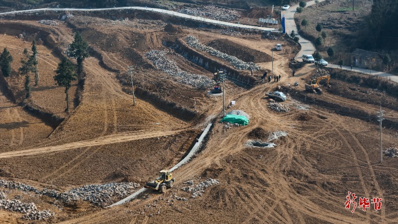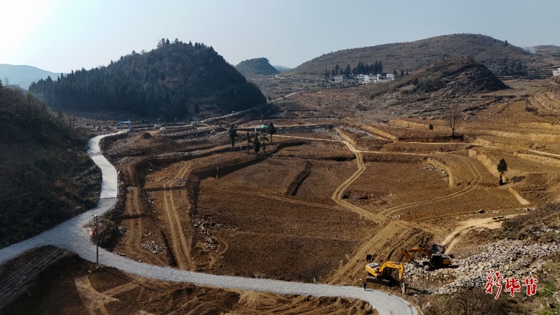 12月19日,在大方县马场镇高标准农田建设现场,挖掘机轰鸣作业,将零散的土地推平成片;新浇筑的水泥路不断向田间延伸……