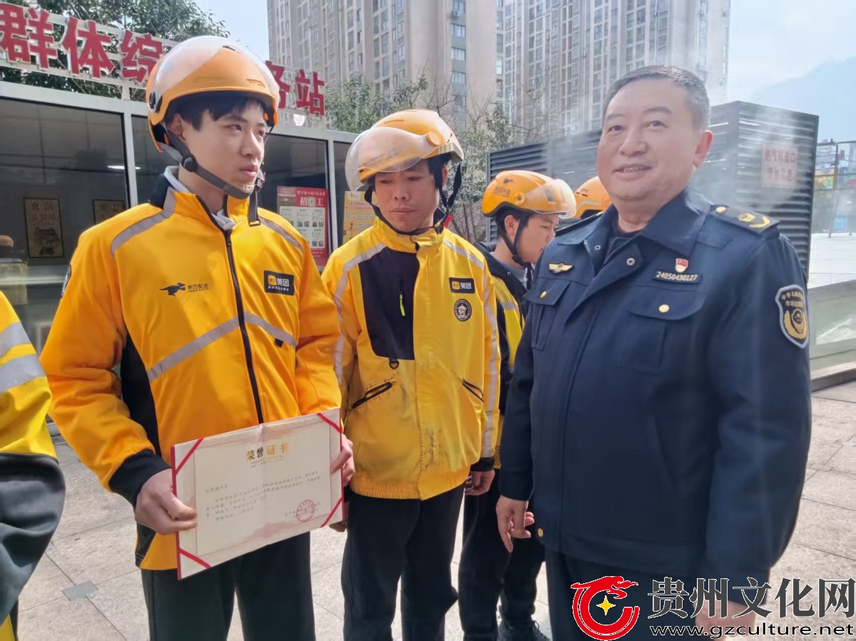 2026年2月6日。金沙县市场监督管理局党组书记、局长沈光达为美团外卖骑手张帮健颁发荣誉证书,授予美团“治安管理员”张帮健“平安守护之星”称号,并号召全局干部职工及全县外卖骑手向他学习。