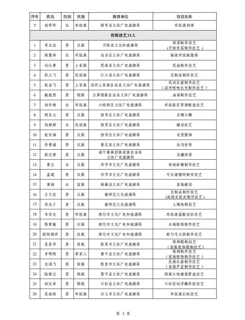 习近平总书记高度重视非物质文化遗产保护传承工作,强调要积极培养传承人,推动非物质文化遗产创造性转化、创新性发展。根据《中华人民共和国非物质文化遗产法》及《贵州省省级非物质文化遗产代表性传承人认定与管理办法(试行)》有关规定,为加强我省非物质文化遗产代表性传承人队伍建设,提升非物质文化遗产系统性保护水平,省文化和旅游厅组织开展第六批省级非物质文化遗产代表性传承人认定工作。经推荐申报、材料审核、专家评审、评审委员会集体审议、社会公示、厅党组审议等程序,确定了第六批省级非物质文化遗产代表性传承人名单(99人),现予以公布。