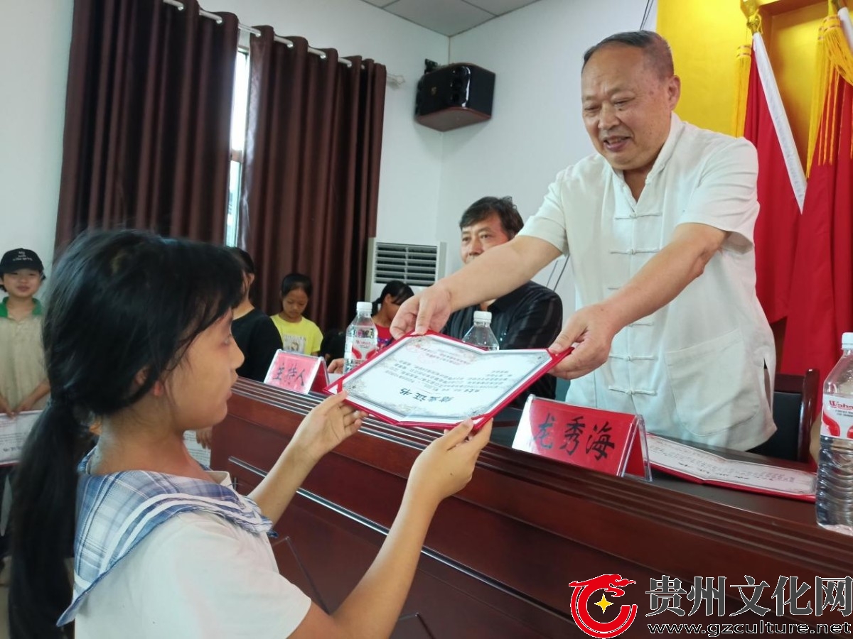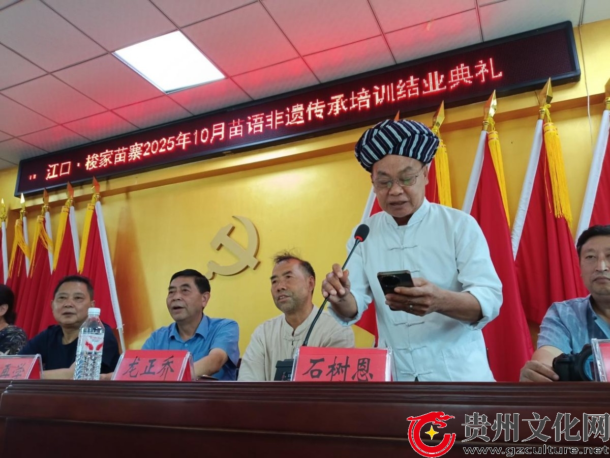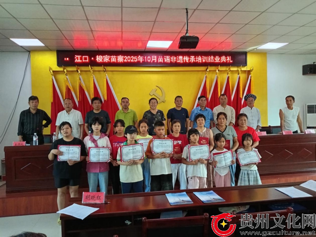 贵州文化网讯(通讯员 周静)金秋十月,梵净山余脉间的梭家苗寨层林尽染,社区会议室里旁欢声笑语、苗音悠扬。10月4日,江口县双江街道梭家苗寨第二次苗语培训结业典礼在此隆重举行。江口县人大常委会副主任王家新,江口县民族宗教事务局、县苗学会相关领导,授课教师代表及全体学员齐聚一堂,共同见证这场承载着民族文化传承使命的“丰收时刻”。