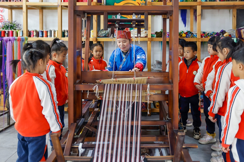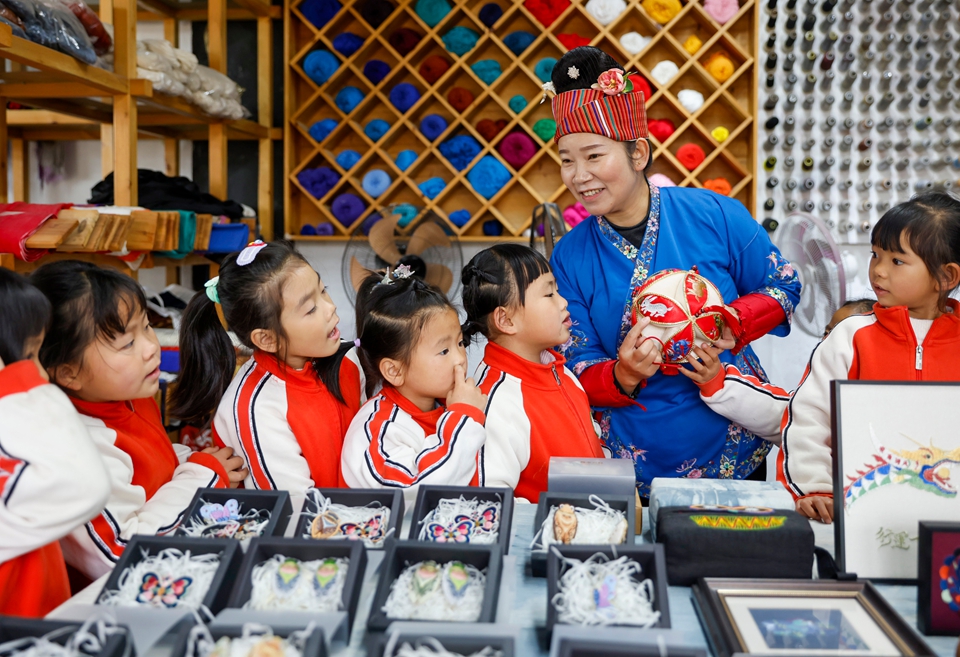 12月10日,贵州省黔东南州施秉县第四幼儿园的孩子们在老师的带领下,走进舞水云台旅游商品开发有限公司非遗苗绣传习中心,沉浸式体验苗绣技艺,学习苗绣知识,感受民族文化的独特魅力。(文/图 磨桂宾)