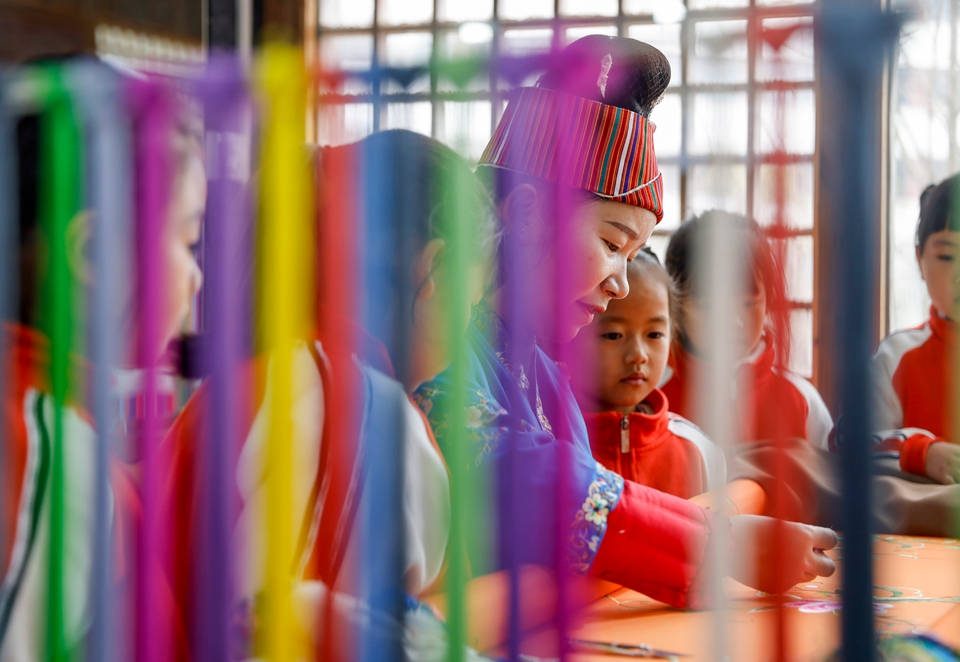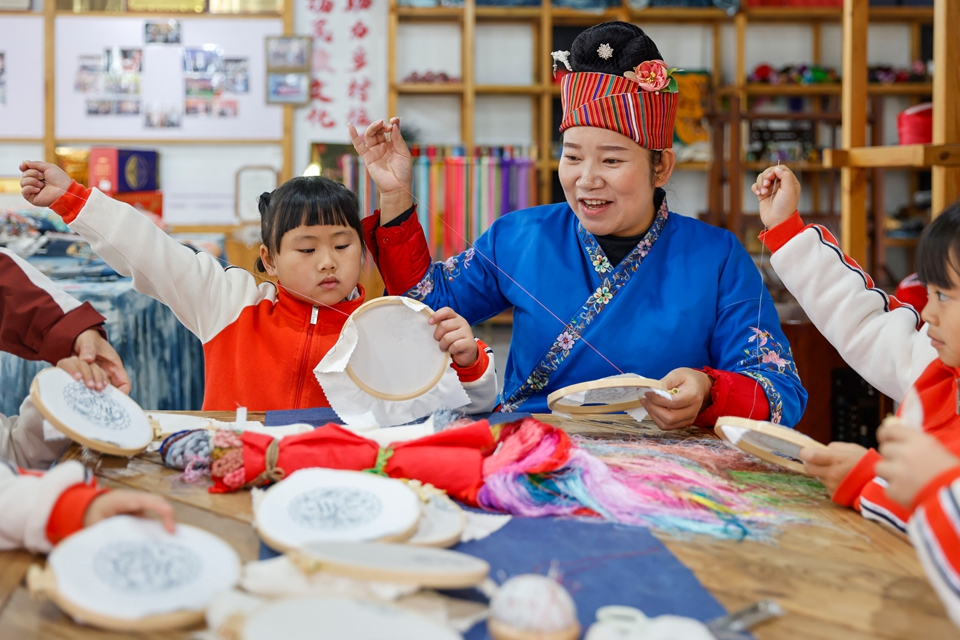 孩子们在非遗传承人的指导下体验苗绣技艺