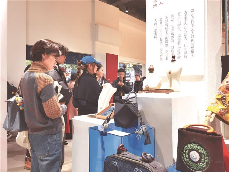 展览现场,《锦绣黔针》《仡佬族二十四节气香包》《苗疆故事·时尚首饰系列》等曾亮相全国的作品吸引人们纷纷驻足观赏。这些作品均来自贵州不同地区“锦绣计划”企业、工坊,涵盖蜡染、苗绣、侗布、竹编等多种非遗技艺,集中展示了近年来贵州女性在非遗手工艺发展中的创新探索和文化自信,成为连接传统与现代、乡土与世界的重要桥梁。(记者 彭芳蓉)