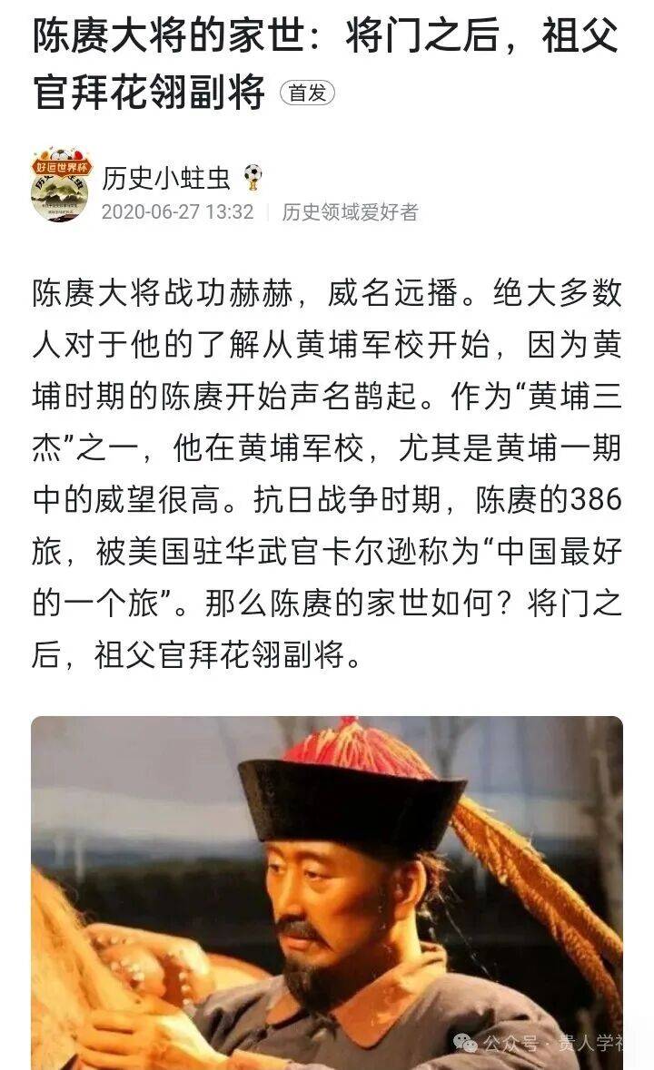 比起三杰中的贺衷寒、蒋先云,陈赓身世显赫。陈赓大将出身将门世家,早在清朝时期,陈赓的祖父就已经官拜清朝花翎副将,和本文介绍的黄平张元龙有同一职衔。