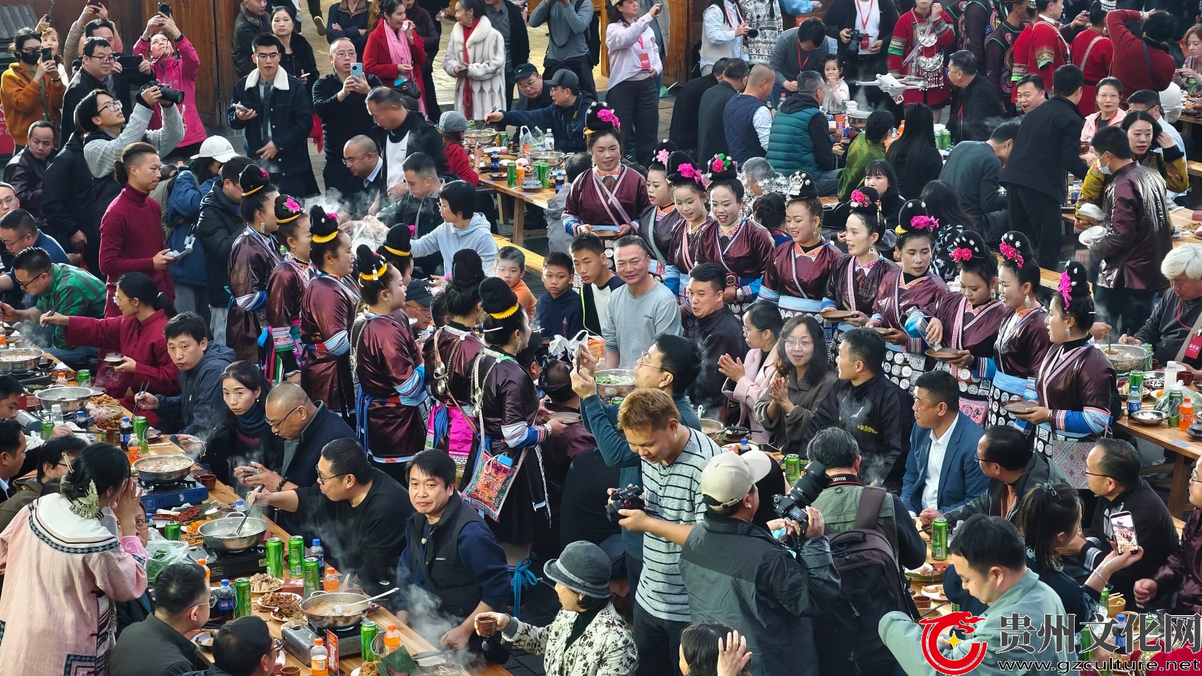 长桌宴席间,涵养待客之礼。拦门酒拉开侗年长桌宴的序幕,身着盛装的侗族姑娘手捧米酒,唱着悠扬的敬酒歌,以“高山流水”的独特方式迎接宾客,尽显侗家人的热情与礼数。席间,侗族阿嫂主动为游客添菜,各族同胞围坐一桌、把酒言欢,推杯换盏间满是“有朋自远方来不亦乐乎”的融洽氛围。游客坦言,这长桌宴不仅品尝到侗家美食,更读懂了“礼”字的深刻内涵。