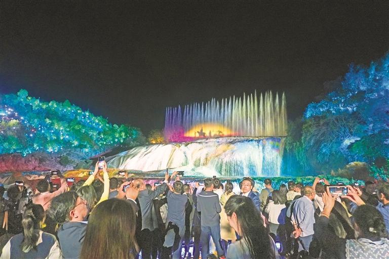 “提质升级后,大瀑布夜游以11个光影篇章串联起自然奇观与民族文化,从‘云端织梦’的光影织布舞到‘神鼓祈水’的声光互动,让游客在光影中体验布依风情。”黄果树旅游区旅游发展中心主任张健介绍,黄果树大瀑布与陡坡塘两大夜游片区客流攀升。