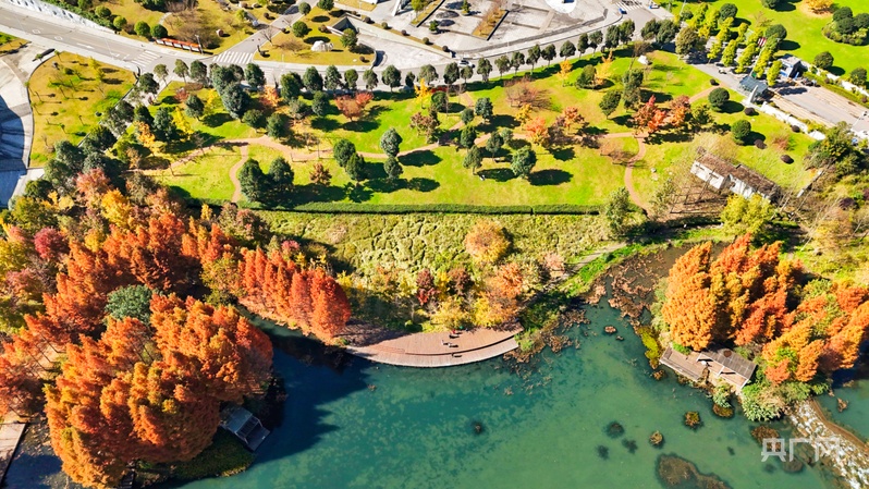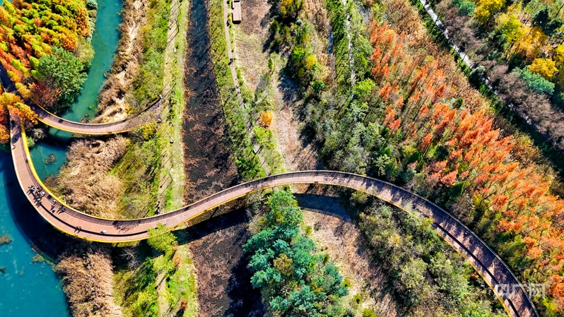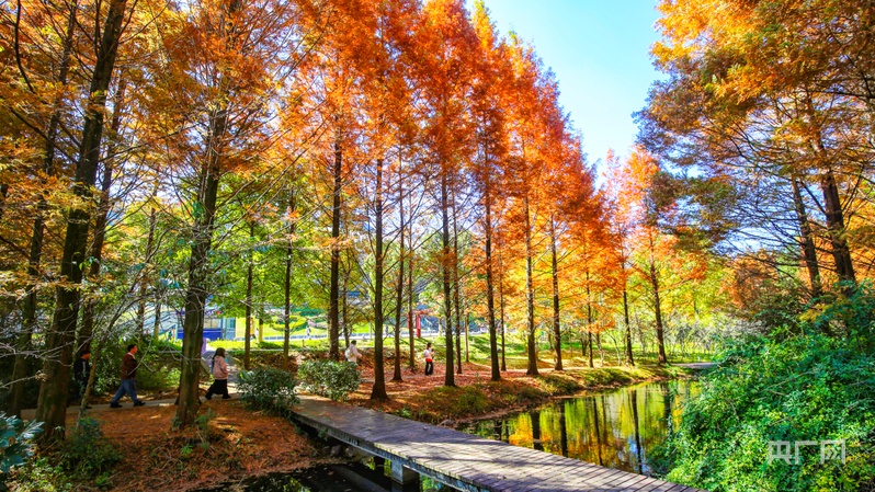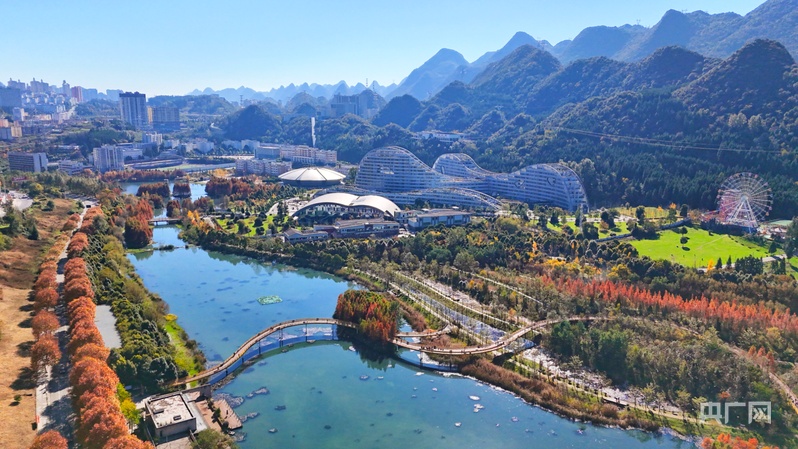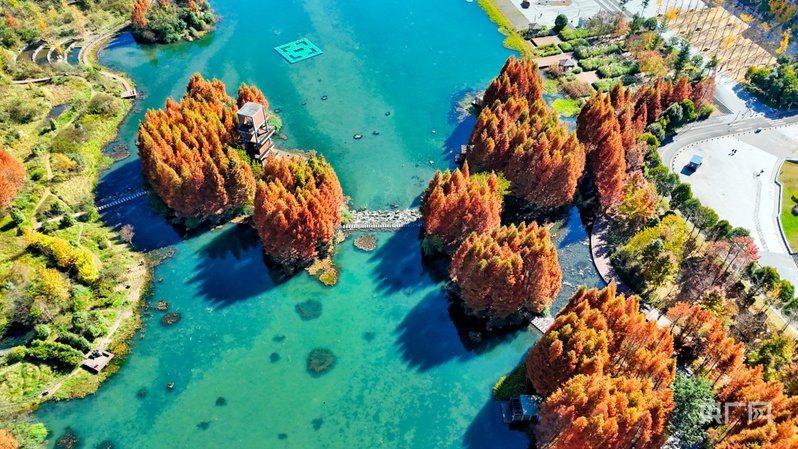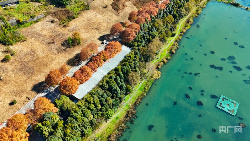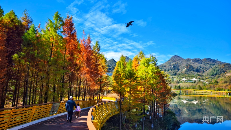 央广网六盘水11月27日消息(记者任振国)连日来,贵州省六盘水市持续迎来晴好天气。在冬日暖阳的映照下,六盘水明湖国家湿地公园展现出斑斓景致——水杉挺秀、梧桐鎏金、红枫似火,与碧蓝如洗的湖面相互映衬。禽鸟时而掠过水面,时而栖于枝头,在光影交错间平添几许生机。整片湿地宛如打翻了的调色盘,吸引众多游客徜徉其间,尽享人与自然和谐共处的静谧与美好。