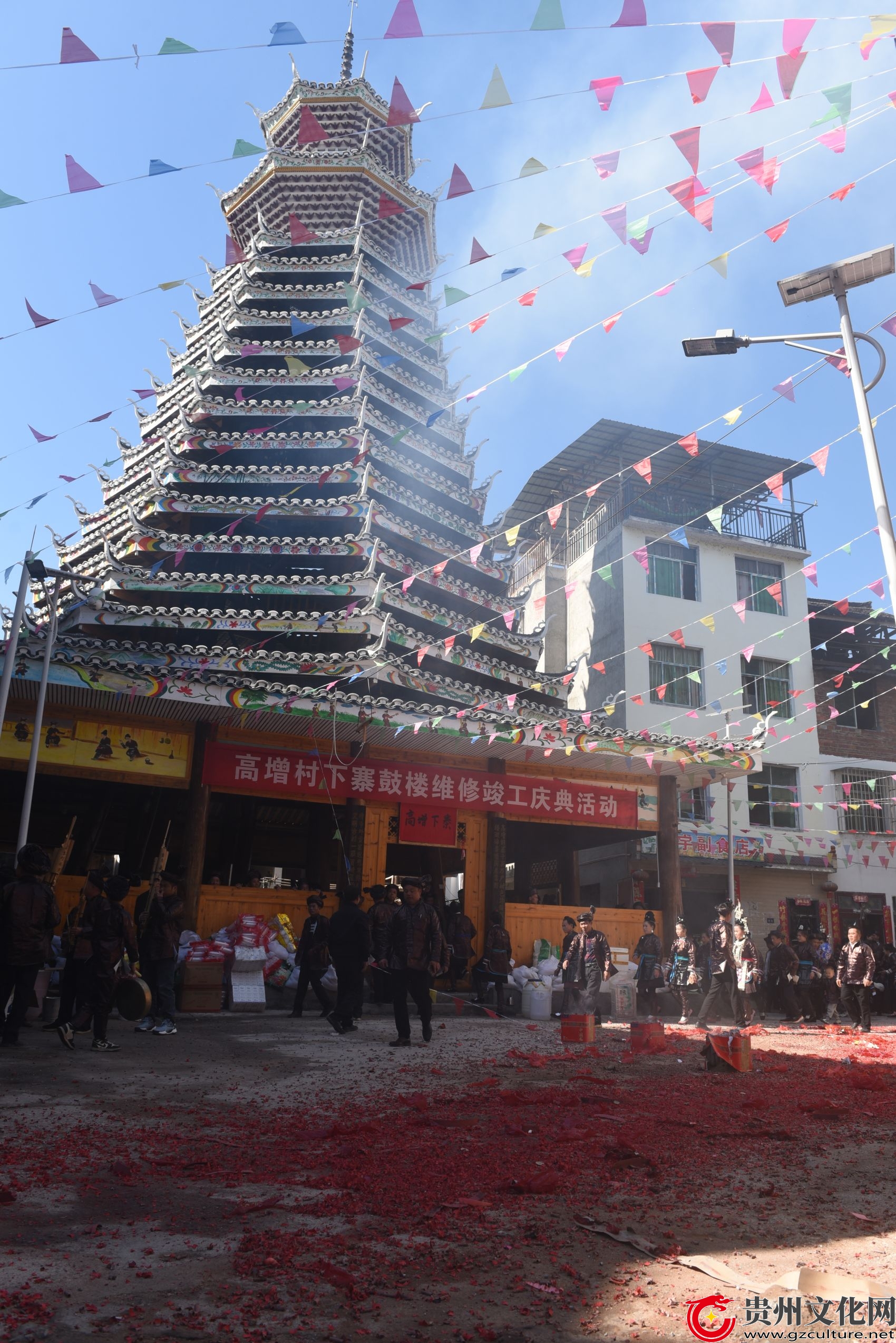 当日,贵州省黔东南州从江县高增乡高增村下寨侗族同胞穿着节日盛装,唱侗歌吹芦笙,和来宾朋友齐聚一堂,共同庆祝鼓楼修缮庆典,庆典活动有内容鼓楼对歌、侗族大歌等文化丰富多彩的节目。