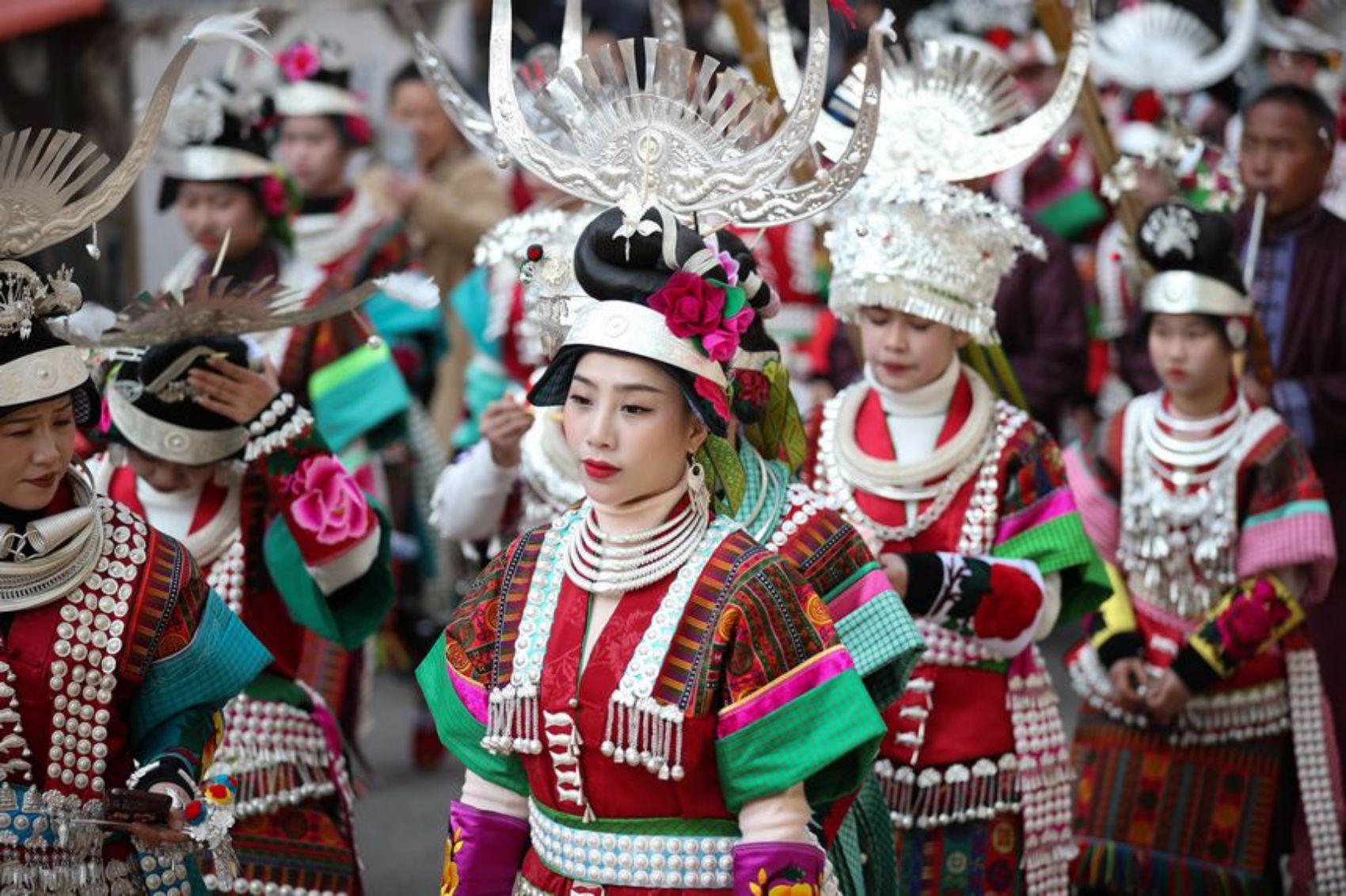 2月17日,身着盛装的苗族村民在贵州省黔东南州丹寨县兴仁镇兴仁村进行盛装巡游