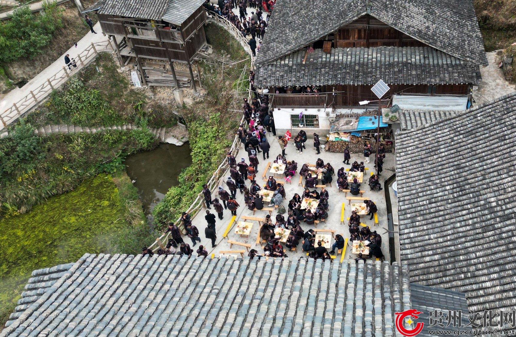 2025年12月20日,在贵州省从江县高增乡美德村,游客与侗族群众在吃团圆饭。
