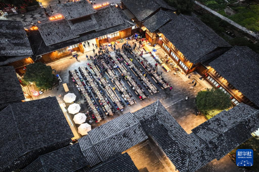 在贵州省黎平县肇兴侗寨,侗族同胞与来宾在侗年活动中共享长桌宴(12月20日摄)。新华社记者 杨文斌 摄