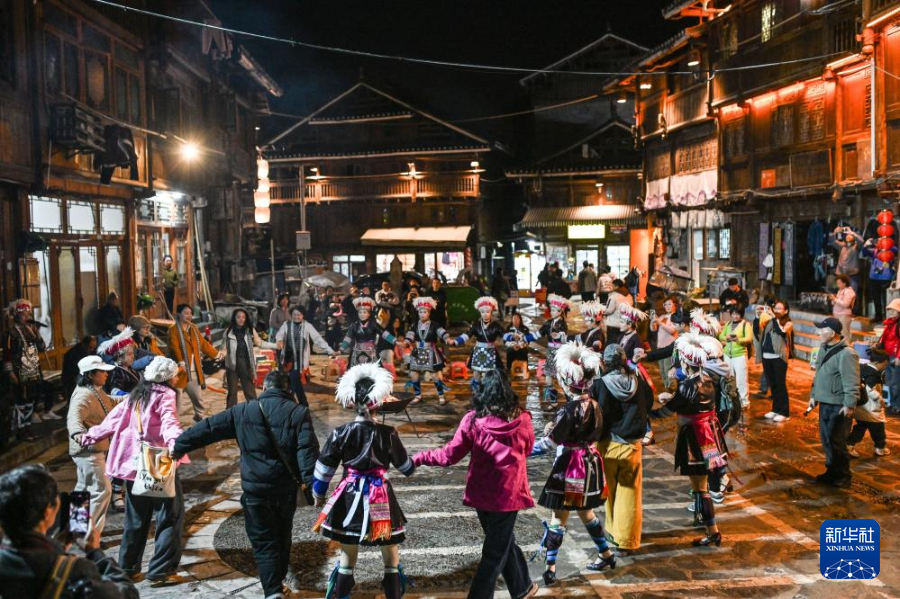 在贵州省黎平县肇兴侗寨,游客与村民在一起跳舞(12月19日摄)。新华社记者 杨文斌 摄