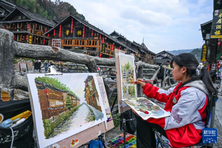 学生在贵州省黎平县肇兴侗寨写生(12月19日摄)。新华社记者 杨文斌 摄