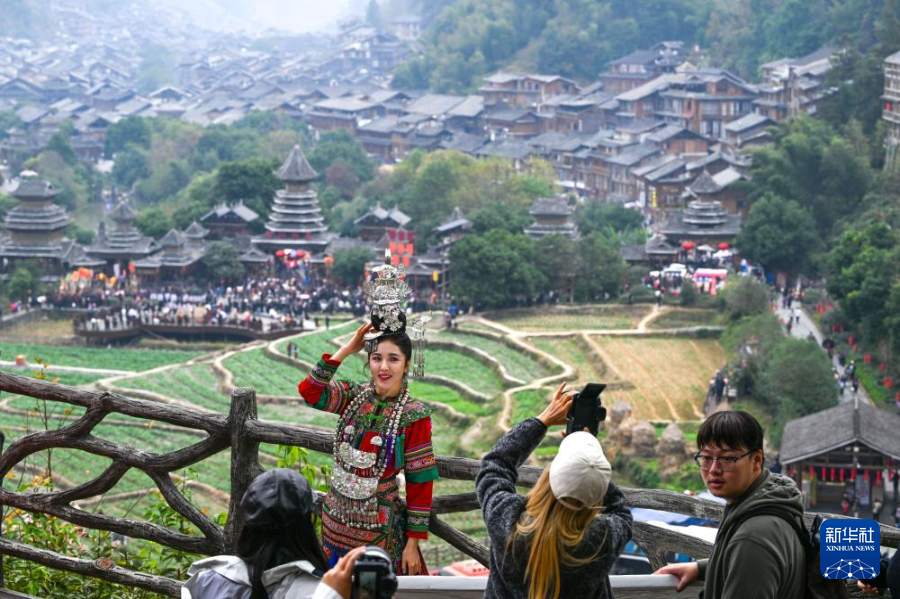 游客在贵州省黎平县肇兴侗寨旅拍留影(12月19日摄)。新华社记者 杨文斌 摄