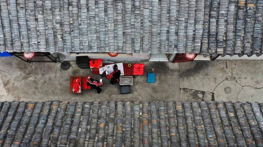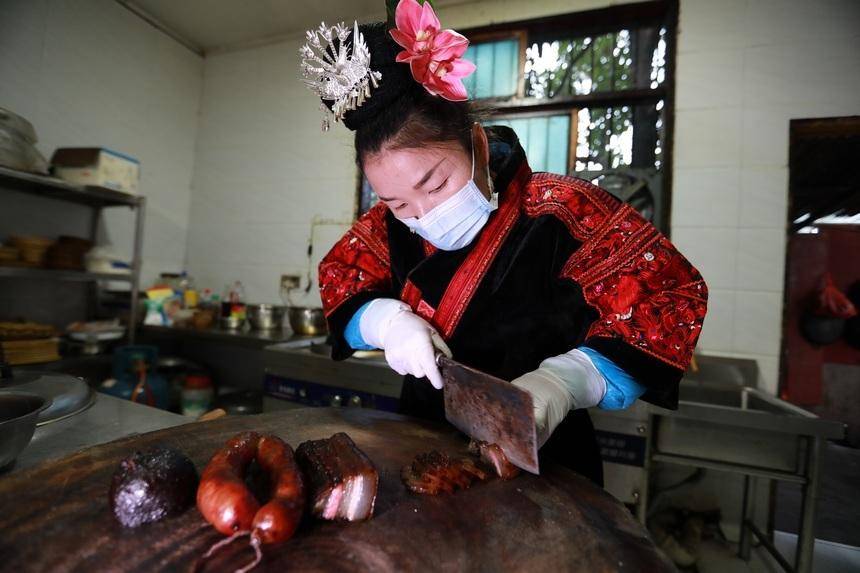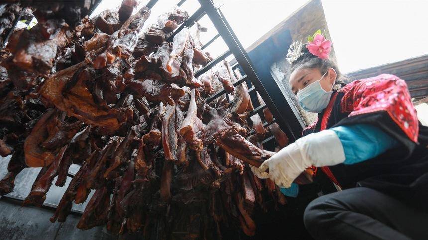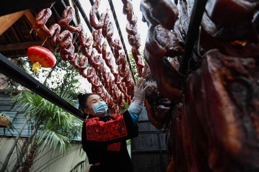 春节临近,在贵州省黔东南苗族侗族自治州剑河县岑松镇温泉村,苗族同胞正忙着腌制烘烤腊肉、香肠、板鸭,线上线下为顾客提供风味浓郁的腊味年货,供应市场。(图/文 万文杰、杨家孟、吴昌连)