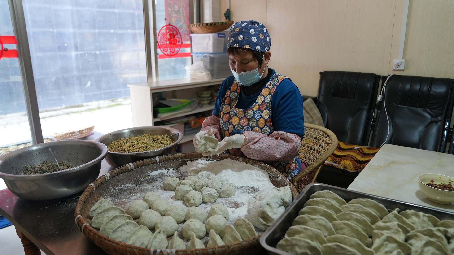 采摘回来的清明菜首先要进行筛选,去掉其中的杂草,选出嫩苗,用清水洗净后,再把它放入锅中煮熟,待颜色变深、静置冷却后就倒入盆中与糯米面、黏米面充分搅拌至均匀,揉好的面团分切成小块备用。这时,负责炒馅儿的师傅抡勺上阵,一时间腊肉香、盐菜香、豆腐香、芝麻香……香飘四溢,等以上工序都完成了,就可以开始包馅儿了,压平的面皮里包上各种馅料,再根据不同的味道捏成不同的形状,整齐摆放在铺满粽子叶的烤盘里,最后放入蒸锅中。半个小时后,一盘盘冒着热气的清明粑就蒸熟起锅了,青绿的颜色,浓浓的香味让人垂涎欲滴,吸引了不少顾客前来购买。