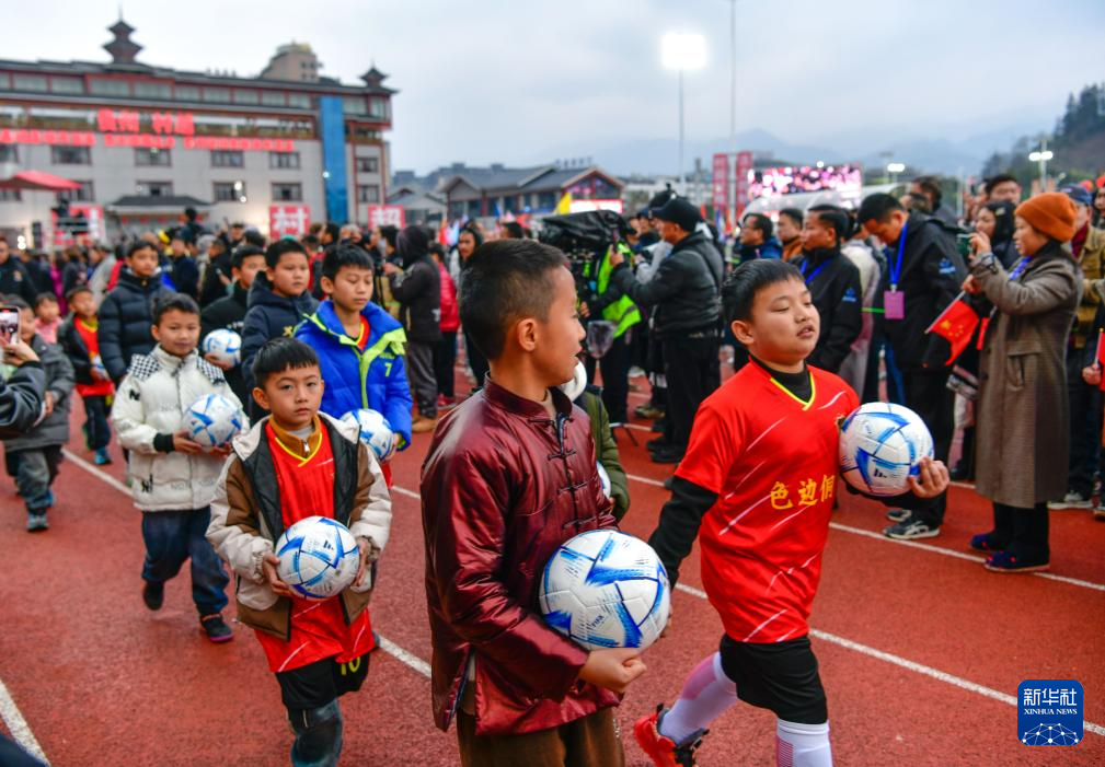 1月2日,孩子们带着足球参加第四届贵州“村超”开幕式巡游。新华社记者 杨文斌 摄