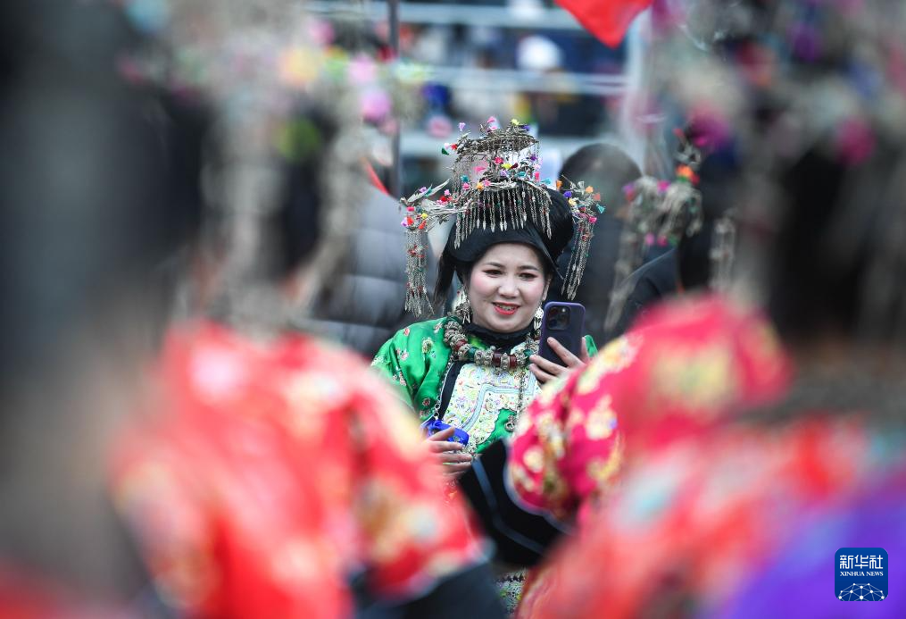 1月2日,侗族群众在第四届贵州“村超”开幕式现场整理头饰。新华社记者 杨文斌 摄