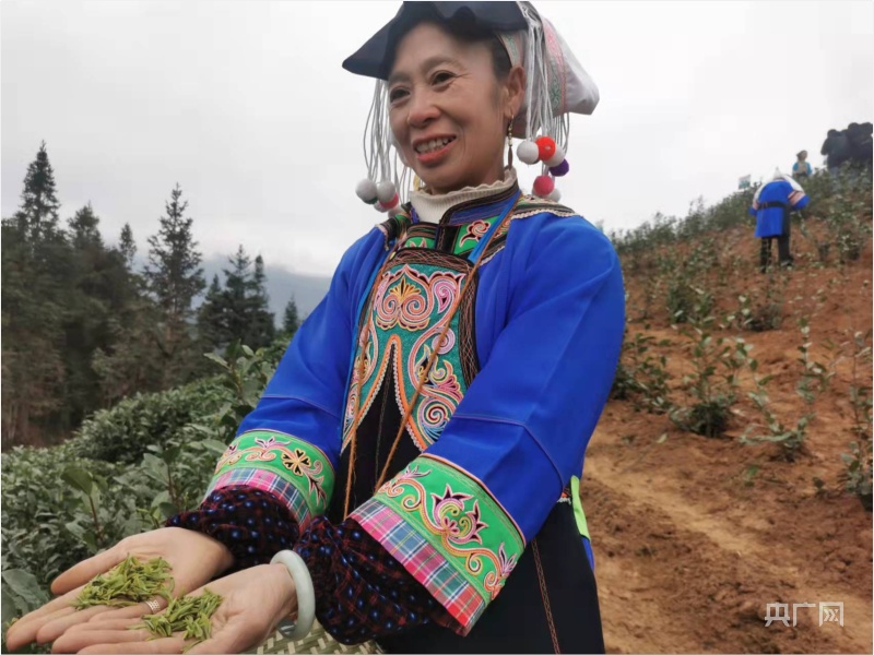 茶农向记者展示刚采的新芽(央广网记者张翼晶 摄)