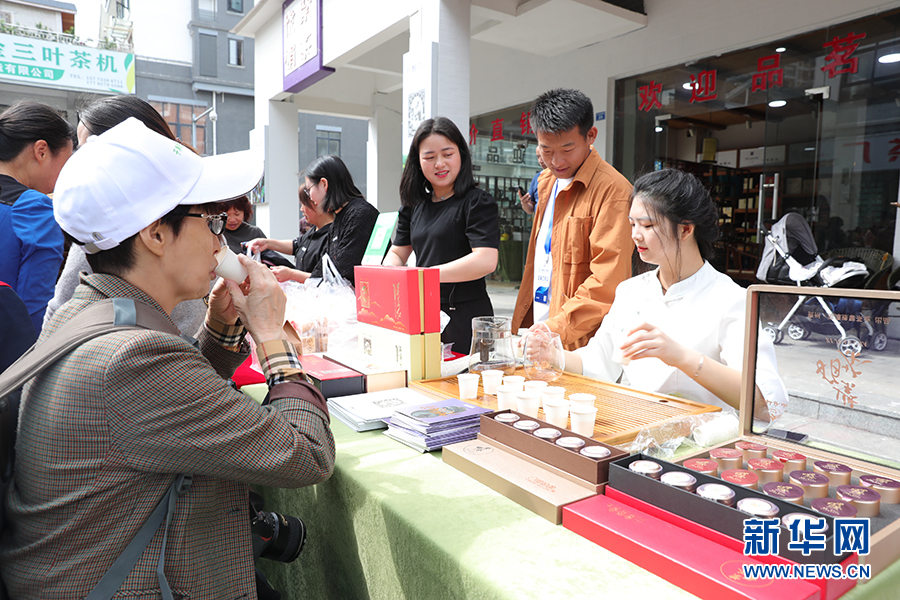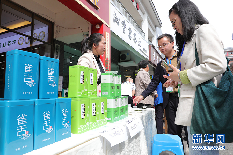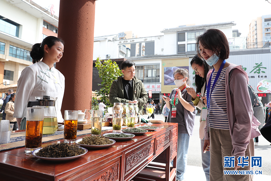 4月15日,与会游客在湄潭县“中国茶城”品茗。新华网 卢志佳 摄