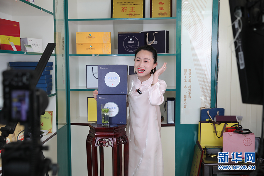 4月15日,网络主播在湄潭县“中国茶城”进行直播带货。新华网 卢志佳 摄