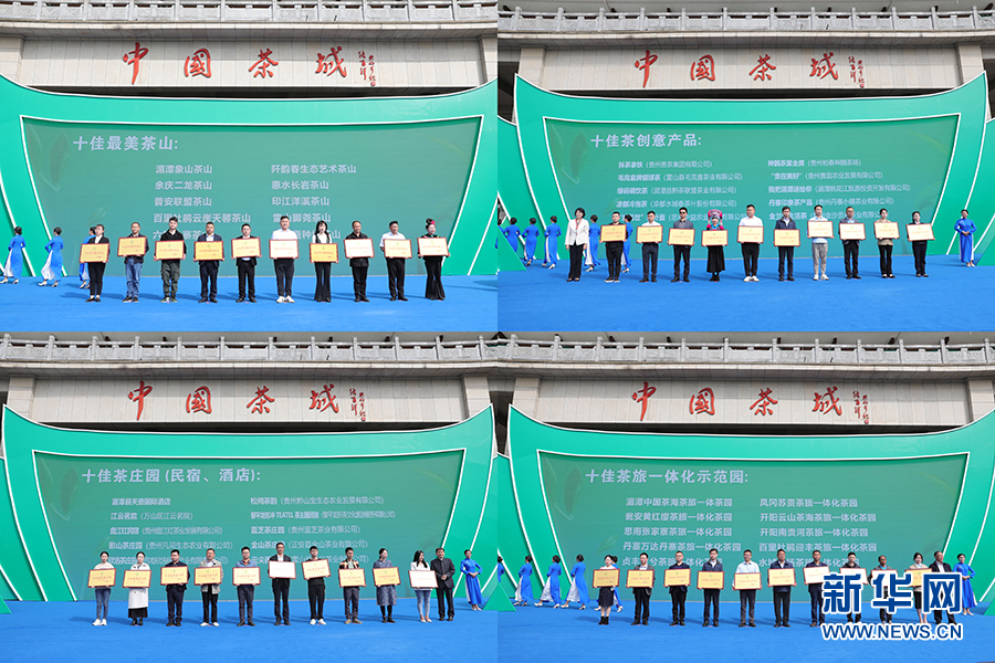 4月15日,会议为贵州十佳最美茶山、十佳茶旅融合示范园、十佳最美茶庄园、十佳茶旅创意产品获奖者颁奖(拼版照片)。新华网 卢志佳 摄