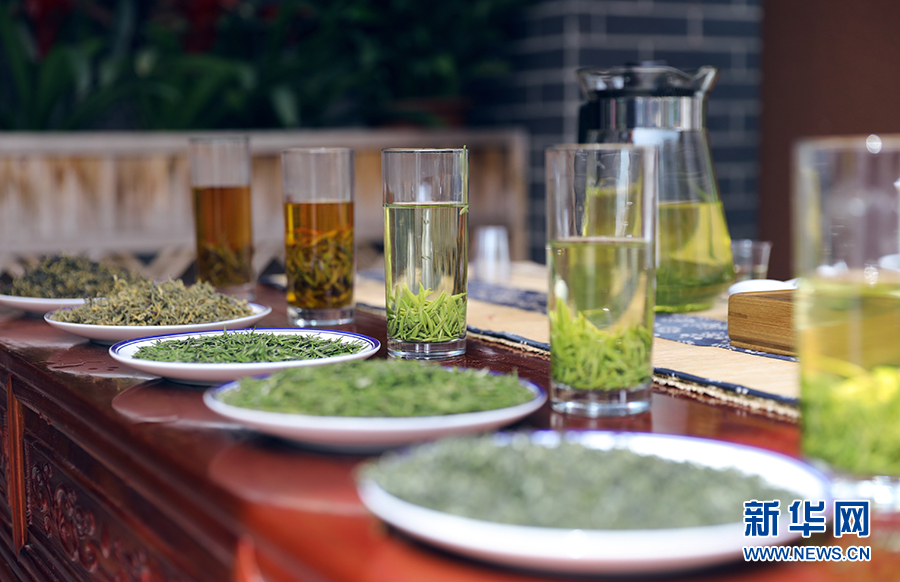 4月15日,湄潭县“中国茶城”的商家展示不同种类的贵州茶。新华网 卢志佳 摄