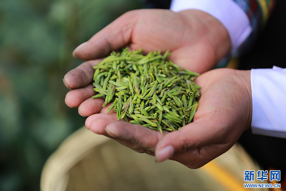1月1日,普安当地茶农展示刚刚采摘的绿茶。新华网 卢志佳 摄