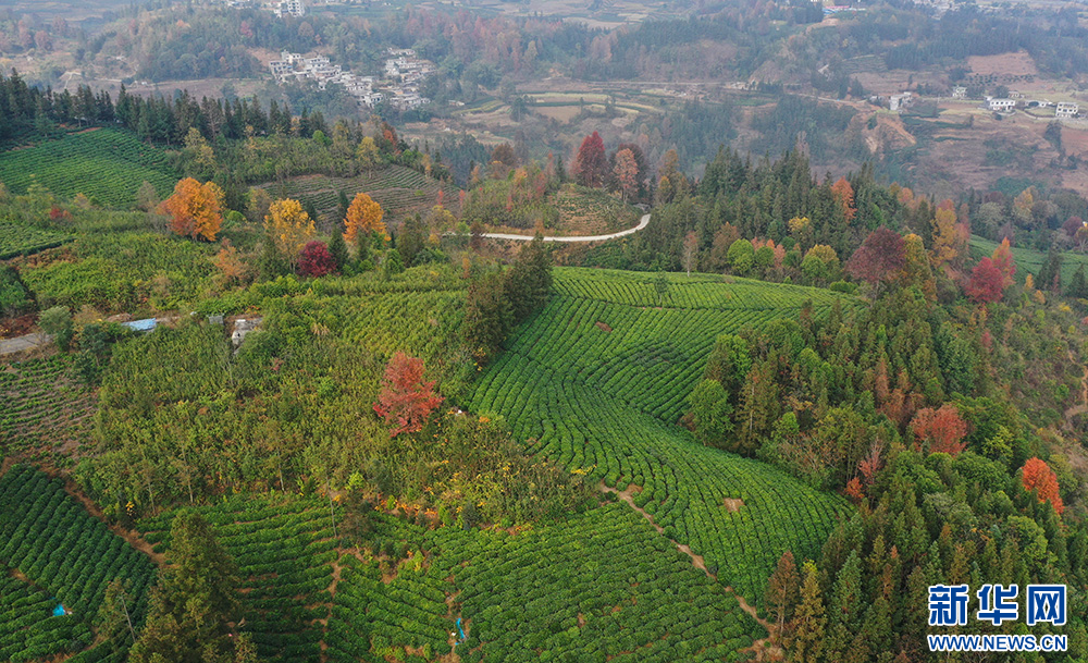 1月1日,航拍普安县茶源街道联盟村的一片茶园。新华网 卢志佳 摄