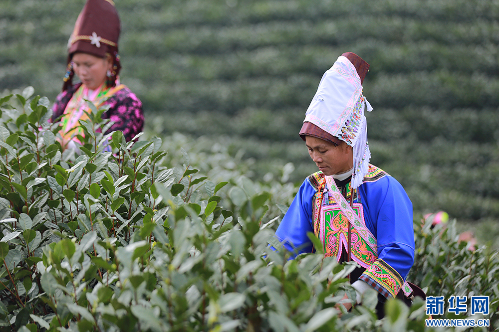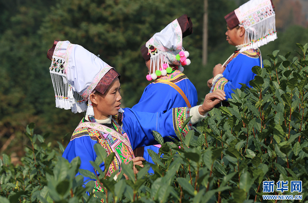 1月1日,普安县当地的布依族茶农在茶园中进行新年“第一采”。新华网 卢志佳 摄