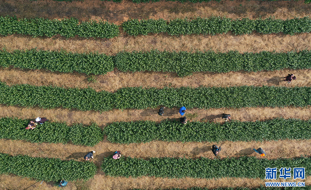 1月1日,航拍普安当地茶农在茶园中采摘贵州最早的绿茶。新华网 卢志佳 摄