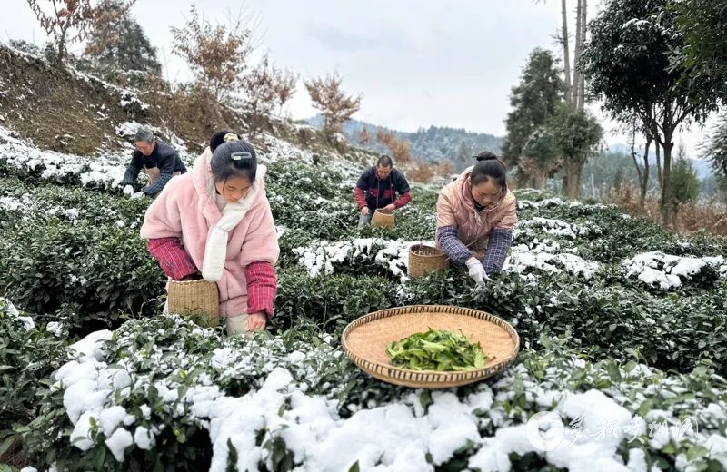 凤冈县新建镇桥塘村村民王志强说:“今天下雪了,也是今年第一场大雪,抢时间采雪茶,我来协助他们,也找点零用钱。”