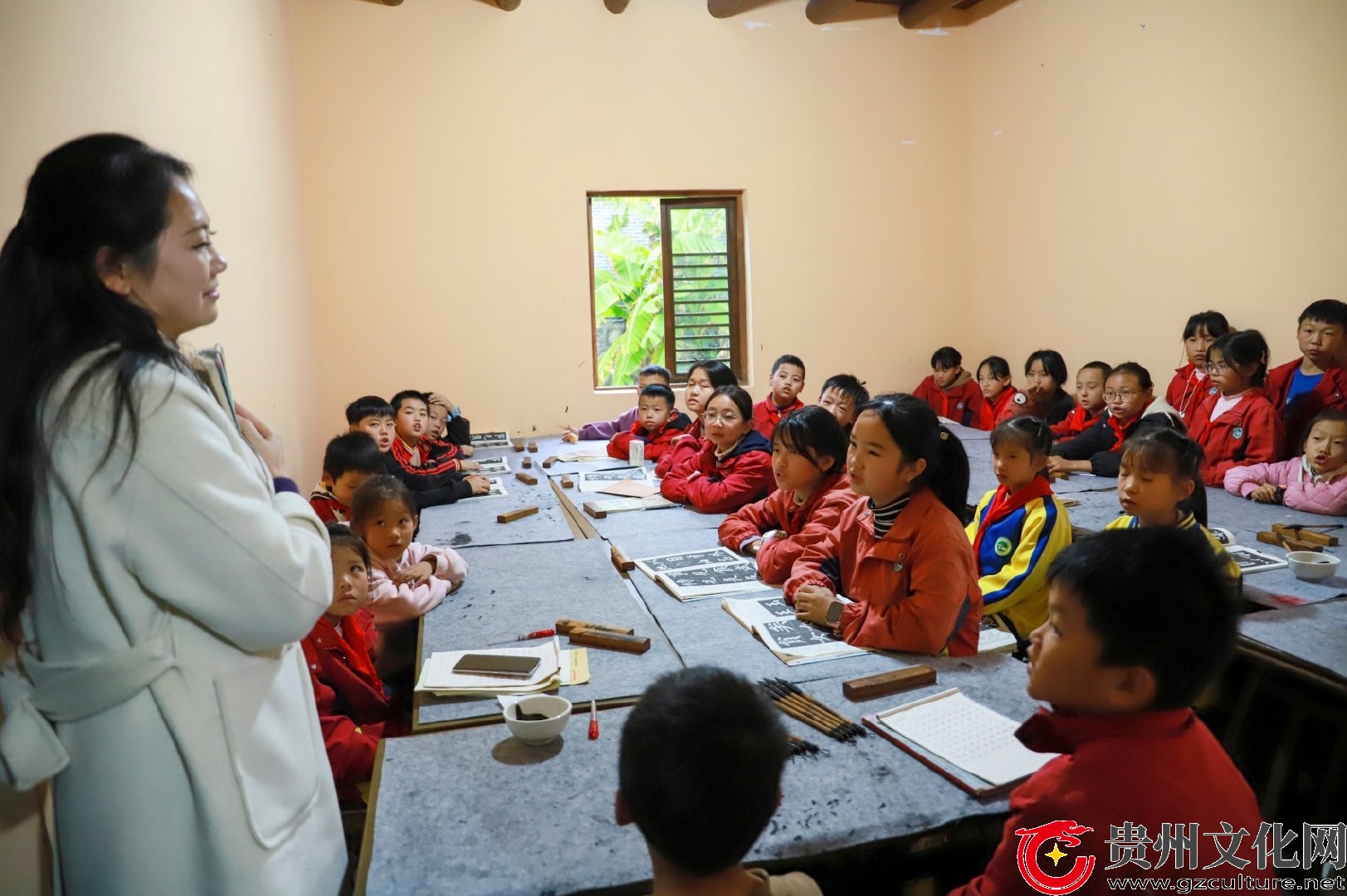 2025 年 11 月 7 日,贵州省黔西市锦星镇白泥社区丁扬斌故居香风园的 “丁扬斌读书会公益书法培训班” 教室里,书法老师穆安琴与社区志愿者正耐心辅导孩子们练习毛笔字。