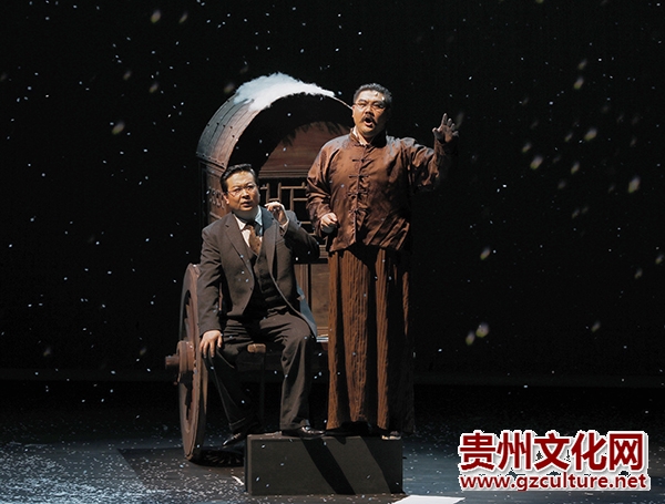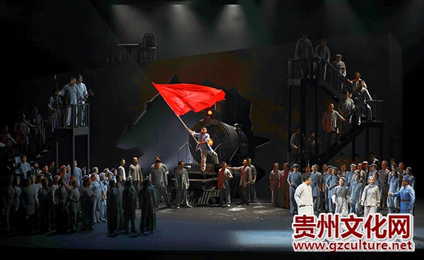 书架、书本、书架墙、传单、文稿、铁链、铁笼、火车头、铁锈、铁板……舞台上处处是“书籍”和“钢铁”:“书籍”隐喻知识分子,喻示思想的火花,昭显启蒙与觉醒;“钢铁”象征工业文明,喻示铁与火的时代,突显抗争与牺牲。