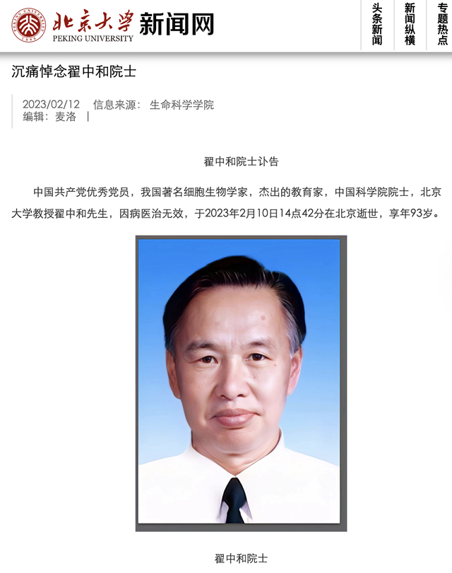 2月11日,北京大学官网发布翟中和院士讣告。