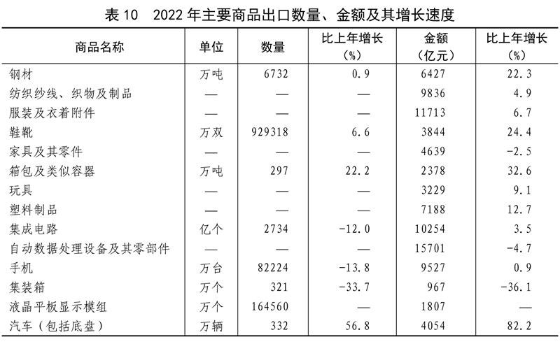 全年货物进出口总额420678亿元,比上年增长7.7%。其中,出口239654亿元,增长10.5%;进口181024亿元,增长4.3%。货物进出口顺差58630亿元,比上年增加15330亿元。对“一带一路”[40]沿线国家进出口总额138339亿元,比上年增长19.4%。其中,出口78877亿元,增长20.0%;进口59461亿元,增长18.7%。对《区域全面经济伙伴关系协定》(RCEP)其他成员国[41]进出口额129499亿元,比上年增长7.5%。