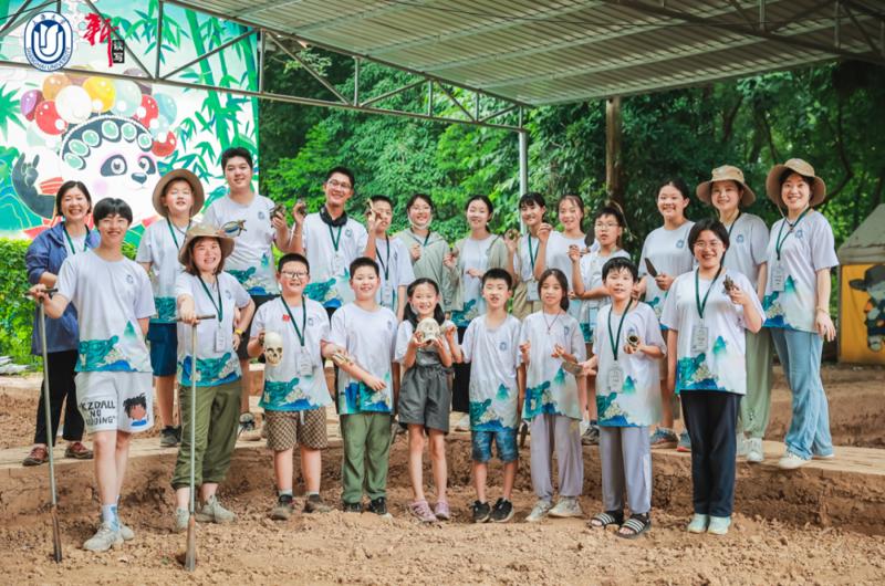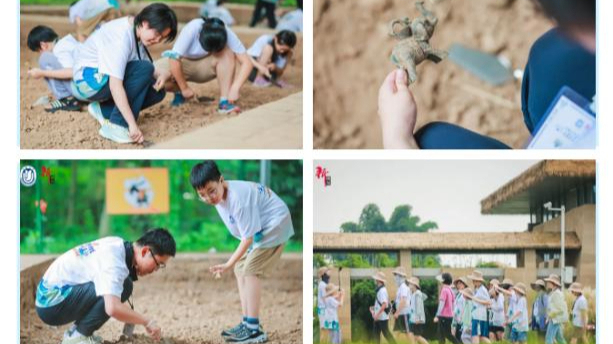 在宝墩模拟考古现场,学生们站在探方内,手持著名的考古工具“洛阳铲”,对照着考古工具的用法,纷纷跃跃欲试。蝉鸣阵阵,汗水披面的学生们蹲在土坑中努力挖掘,或是三五结队互相合作着勘探,每个“出土文物”都能让人成就感爆棚。