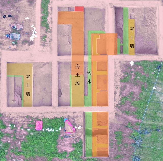图4 魏晋水道上述三处考古工作的持续开展不仅丰富了对于北魏洛阳宫城形制布局的认识,十六国时期遗迹和遗物的确认则为今后进一步辨识洛阳宫在魏晋、十六国、北魏三个时期的结构与变化打下了坚实基础。邺城遗址位于河北省邯郸市临漳县西南,是曹魏至北齐六朝故都。2022年度工作重点最初集中于宫城东北角,后扩展至宫城西北角。通过发掘确认,宫城东北角由两道宫墙组成,中间形成夹道。内侧宫墙宽约1.8-2.3米,外侧宫墙宽约2.45-2.5米,墙体内外均涂抹白色墙皮,局部还有朱红色影作木柱。外侧宫墙东侧有一排小型房屋,南北向分布,周匝环绕散水。这排房屋所处夯土台基东西宽约5.2米,已揭露出7间。(图5)宫城西北角破坏略为严重,但第二道宫墙也得以确认,只是墙体无存,仅余基础。出土遗物以砖瓦类建筑构件为主,种类和类型均较为丰富,制作精良,为文化层和遗迹年代判断以及相关研究提供了重要基础。综合勘探与发掘情况来看,此次发现的系东魏北齐邺宫的第一重宫墙,为复墙形式,两墙之间形成约7.7米宽的夹道。由此来看,之前发掘的第二重宫墙结构亦大致相似,墙体宽3-4米,两墙间距约6-7米。上述考古发现为探索东魏北齐邺宫平面布局不断积累着重要基础资料。