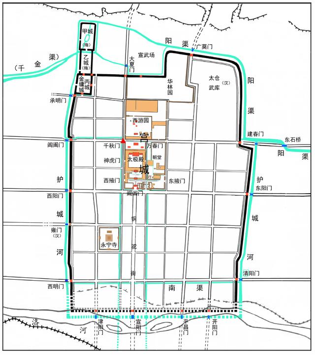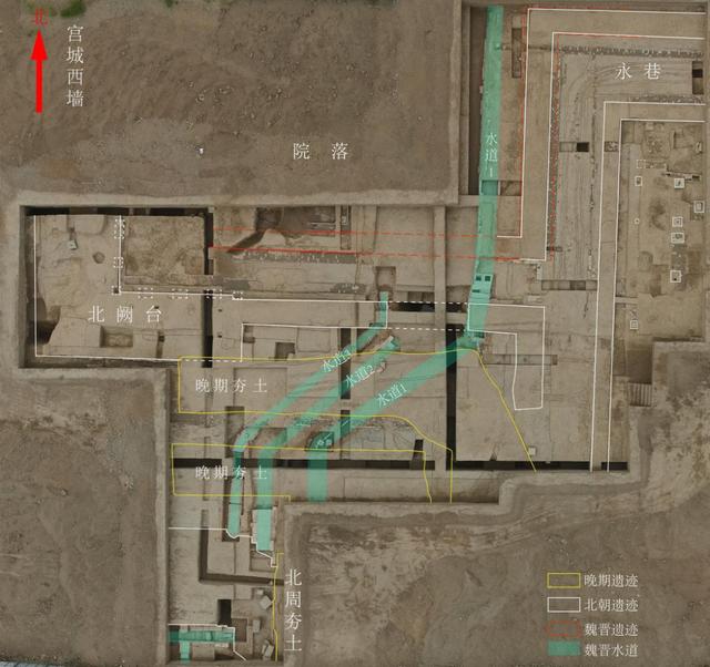图1 汉魏洛阳城永巷东北砖池出土十六国瓦件在宫城东墙的发掘中,了解到东墙墙体宽约3.5米,其内侧有南北向顺墙的砖砌水道,外侧有宽度超过27米的道路。同时,在宫墙内侧发现两座东西并列分布的地下式仓窖,其口部破坏严重,直径约11米、深约7米,其中1座仓底发现少量炭化植物遗存。仓窖北侧和仓窖间还发现有夯土隔墙,宽约1.2米。结合勘探了解到,在司马门内大道以东、东掖门大道以北、永巷以南、宫城东墙以西区域内分布有大量类似仓窖,总数约240座,在宫城东部形成了一个较为独立的仓窖区,发掘者认为该仓窖区可能是北魏时期皇家府库遗迹。千秋门是北魏宫城西墙上自南向北第三座宫门,也是内城阊阖门至建春门大道贯穿宫城的重要节点(图2)。过往发掘显示,千秋门与宫城正门阊阖门、神虎门形制相似,皆为“曲尺形双向子母阙”式殿堂类门址。本年度对千秋门遗址进行了解剖发掘,发现门址在北周时期进行了大规模的重建,早期门址的形制目前尚不清楚。目前发现的门址西侧子母阙阙台始建于魏晋时期,北魏在其基础上加以改建。在千秋门门址的阙间广场下层,解剖发现保留有魏晋时期的大型地下水道遗迹,其下还发现汉代的大型砖券水道(图3)。魏晋时期的石砌水道基本是由底板、侧板、盖板构成的水涵洞,虽具体砌筑细节有所差别,但“石工细密,非今之所拟,亦奇为精至也”(图4)。这样的大型水道遗迹在汉魏洛阳城的发掘史上尚属首次发现,整套完备的水利设施集中反映了魏晋时期水利工程的成熟技艺,以及当时都城对水资源利用和环境改造的认知水平。