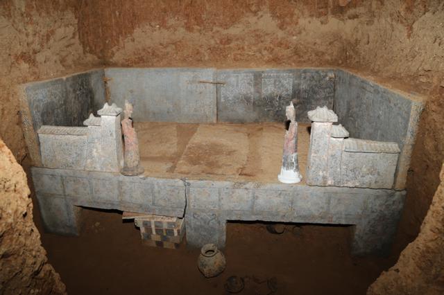 图7 西安北陈村墓群朱仓北朝墓位于洛阳市孟津区平乐镇朱仓村东北部,洛阳市考古研究院于2022年10月在进行小浪底南岸灌区建设项目的考古发掘中发现,共发现3座呈“品”字形排列的墓葬。这三座墓葬均坐北朝南,为长斜坡墓道单室土洞墓,墓中最为重要的发现是2套围屏石棺床,发掘者推测墓葬年代为北魏末年至东魏时期。M260围屏石棺床由石屏风和石棺床两部分组成,图像为减地平钑,局部涂朱贴金。石屏风上除1幅似为男性墓主人外,其余内容为“郭巨埋儿”“老莱子戏彩娱亲”“秋胡戏妻”“临深履薄”等孝子、列女、高士故事及墓主出行仪仗,棺床外侧为狮子、畏兽等神兽图像。墓中随葬器物多为陶器,有罐、碗、盘、俑、铜构件等(图8)。M262围屏石棺床结构同M260,但未配石刻子母阙。石屏风上未见墓主人图像,仅有“董永七仙女”“郭巨埋儿”“孝孙原榖”“伯俞泣杖”等孝子故事,及侍女持帐出行等画面。棺床上部为高浮雕双层莲瓣,莲瓣全部贴金并有红绿彩绘,其下内容为狮子、畏兽和千秋万岁等图像。墓中出土器物以陶器为主,有壶、罐、盘、碗,以及仓、灶、井、磨、等模型明器和镇墓兽、人俑、动物俑等陶俑。M261未发现围屏石棺床,但甬道内出土部分石棺头挡残块,经初步清理图像有神人、门吏、畏兽等,局部涂朱贴金。墓中随葬器物多为陶器,有仓、灶、井、磨、碓,以及人俑、动物俑、铁环等。此次发现的围屏石棺床为洛阳地区首次考古出土,石围屏的图像内容以中原传统的孝子和出行故事为主,艺术水平较高,但两套围屏的图像风格又有所差异,反映了北魏晚期以后绘画风格的变化,逐渐由“瘦骨清像”向“雄健饱满”转变的过程。该项发现入选了“2022年度河南省五大考古新发现”。