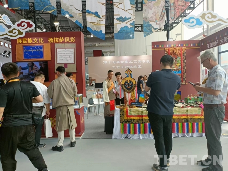 拉萨传统手工艺展厅位于2号馆北京市工艺美术展区,展位以藏式民居风格为主,配合55寸电视大屏、背景墙、打卡点及产品展览区域,充分展现拉萨民族特色。参展作品包括唐卡、堆绣、藏香、藏纸、特色创意文创产品等八大类40余种,现场还设置了互动项目,包括藏装体验,甜茶、酥油茶品尝,藏纸书法鉴赏,唐卡鉴赏和舞蹈、歌曲表演等。产品琳琅满目,观众络绎不绝。
