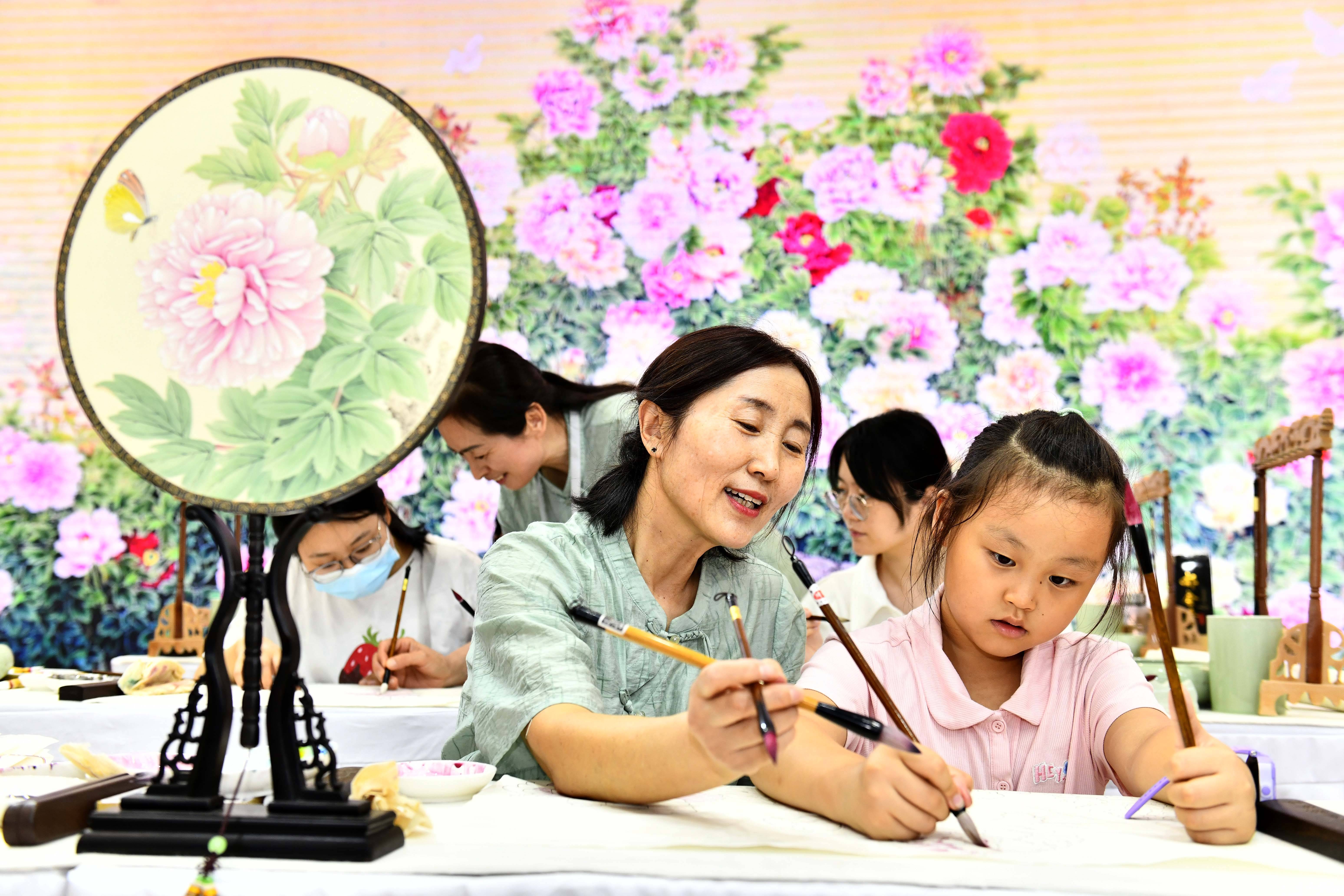 9月16日,在山东国际会展中心,来自巨野书画院的艺术工作者姚爱红教孩子给工笔牡丹画上色。 新华社记者 郭绪雷 摄