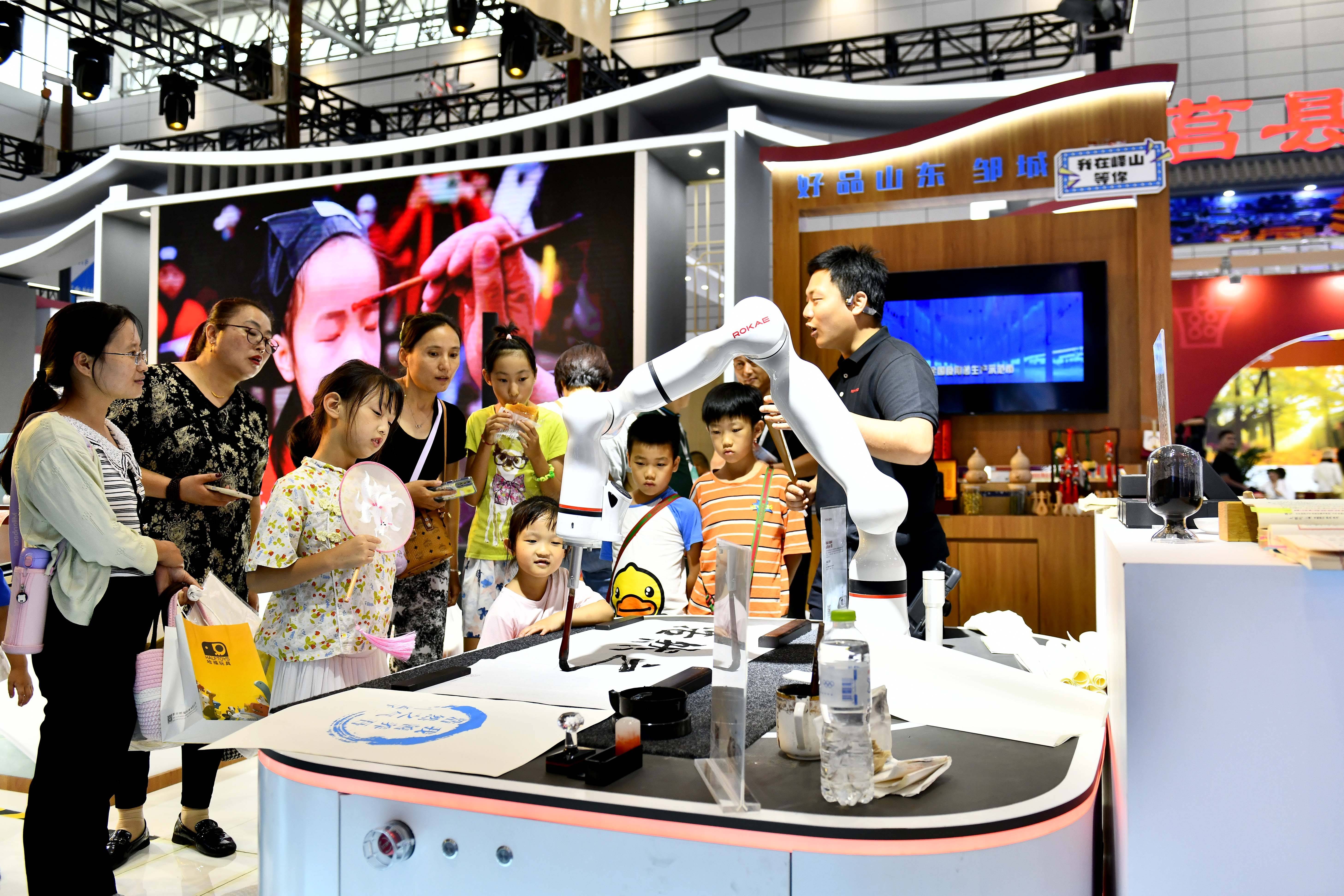 9月16日,在山东国际会展中心,来自济宁市的参会人员在展示机器人书写汉字。 新华社记者 郭绪雷 摄