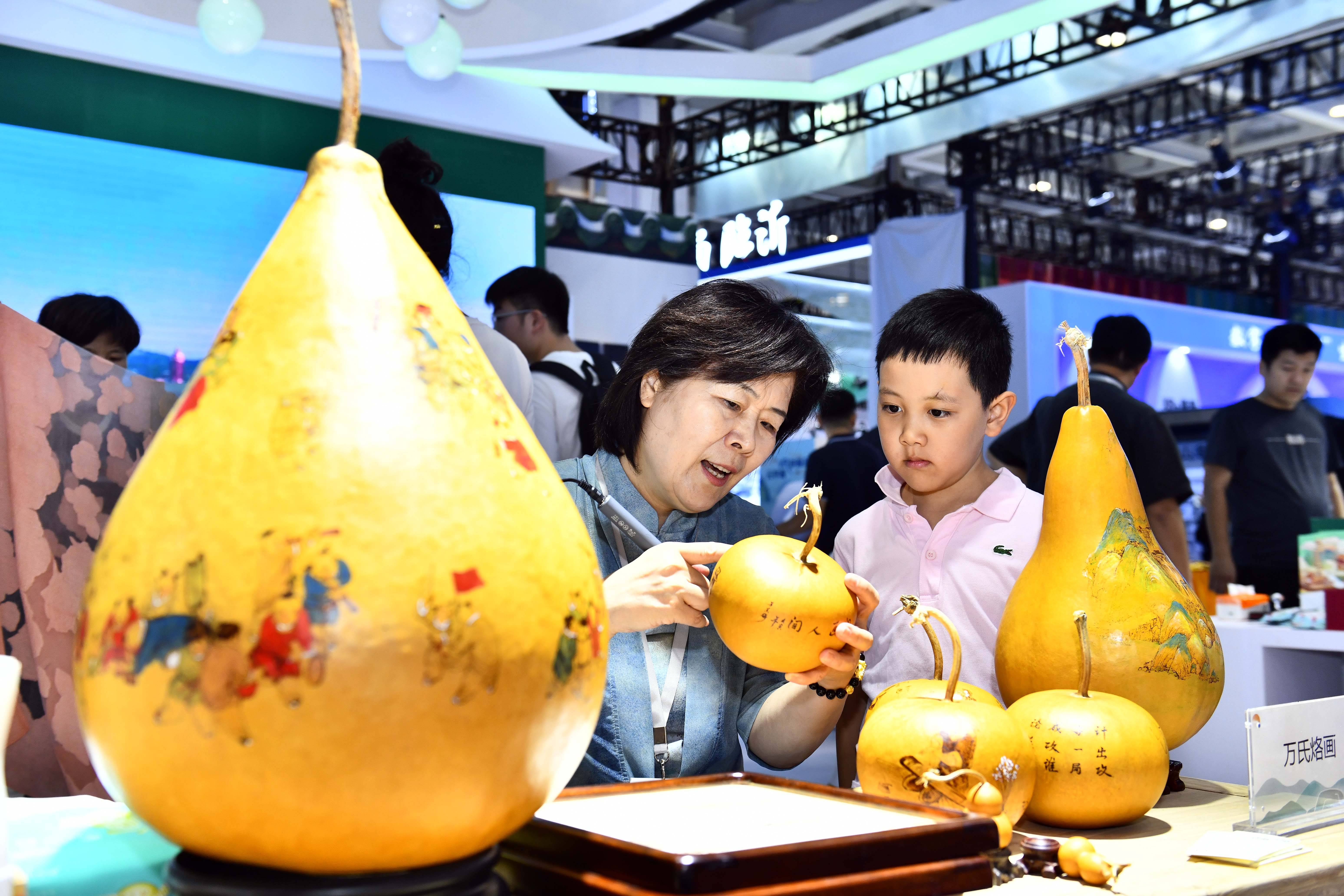 9月16日,在山东国际会展中心,葫芦烙画非遗传承人万东梅向前来参观的小朋友介绍烙画的魅力。 新华社记者 郭绪雷 摄