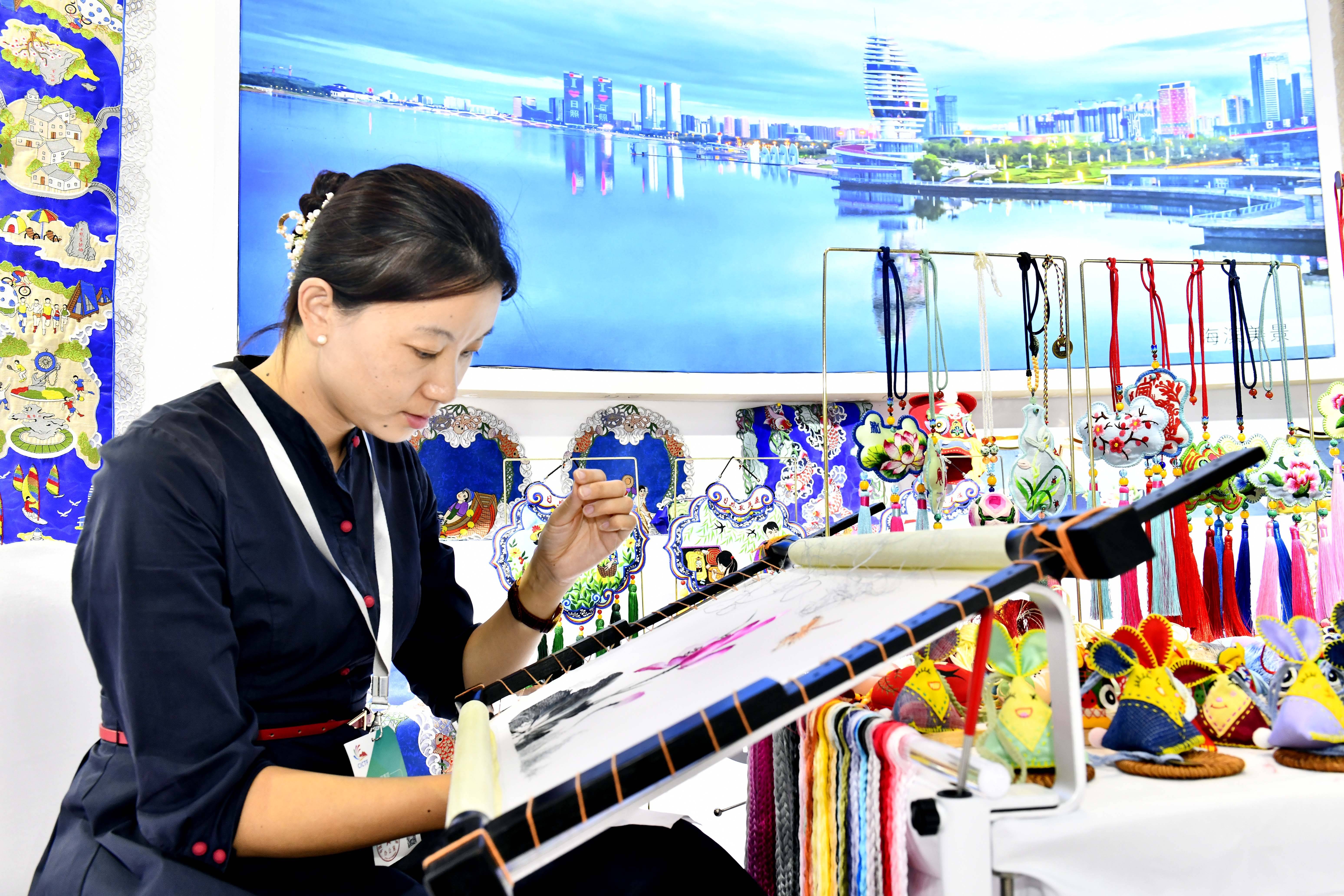 9月16日,在山东国际会展中心,日照市刺绣非遗传承人李兆梅现场展示刺绣技艺。 新华社记者 郭绪雷 摄