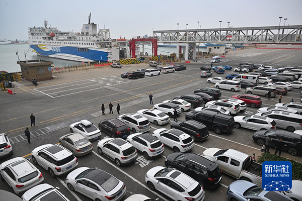 2024年1月26日,车辆在海口新海港等待登船。新华社记者 郭程 摄