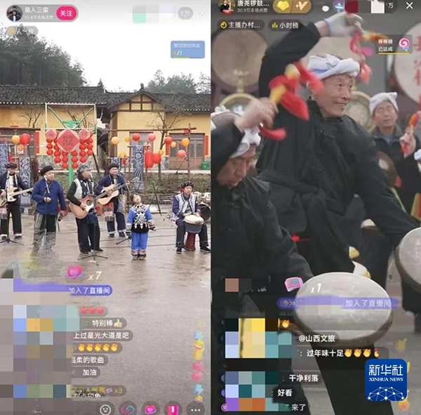 湖南省凤凰县腊尔山镇苗寨中,4个“90后”苗族小伙组成乐队自办“村晚”,规模不大,唱火家乡;山西临汾的村民们用簸箕、黄豆当乐器,配合唢呐和非遗晋南威风锣鼓,直播连线上千公里外的苗乡,南北大联欢释放独特的精彩,吸引在线观众近800万人……