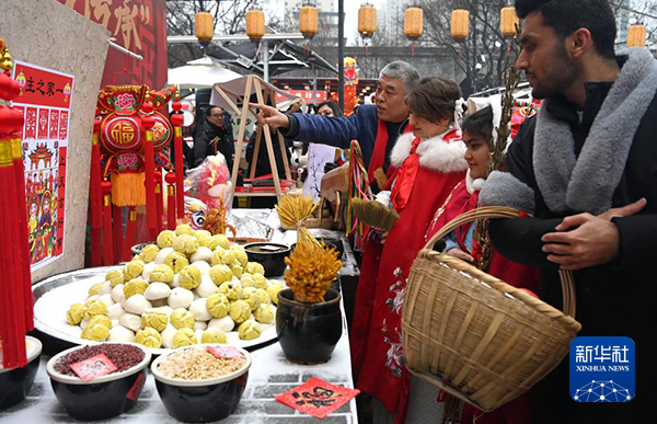 2月2日,在西安永兴坊举行的小年活动上,来自西安各大学的留学生在民俗专家的讲解下了解小年祭灶所用的物品。新华社记者 刘潇 摄