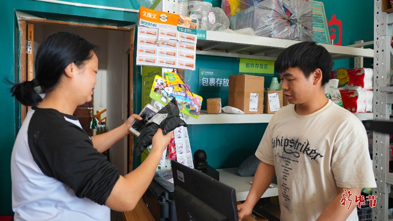 下午的小店更显热闹。徐光亮要给在宁波打工的妻子寄去家乡的辣椒面;刘义拿到了网购的牛枷担,解了农忙的急;地上,打包好的腊肉正等着发往汕头。李杰忙着扫码、打包、收款,小小的空间里,充满了包裹摩挲的声响。