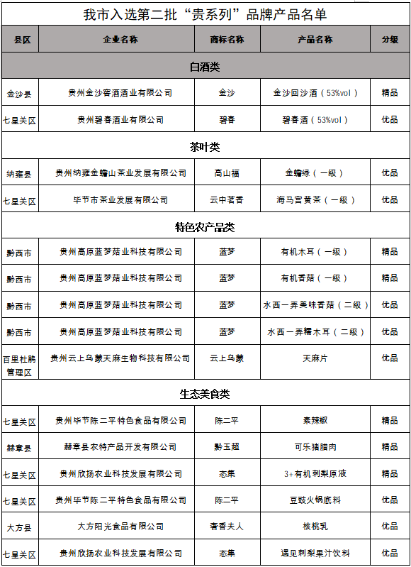此次入选的15个产品中,金沙回沙酒、碧春酒、金蟾绿茶、海马宫黄茶、有机木耳、有机香菇、水西一弄美味香菇、水西一弄糯木耳、天麻片、素辣椒、可乐猪腊肉、3+有机刺梨原液、豆豉火锅底料、核桃乳、遇见刺梨果汁饮料等产品获评“贵系列”品牌。其中,金沙回沙酒、有机木耳、有机香菇、素辣椒、可乐猪腊肉、3+有机刺梨原液等6个产品被评为精品,其余9个产品被评为优品。